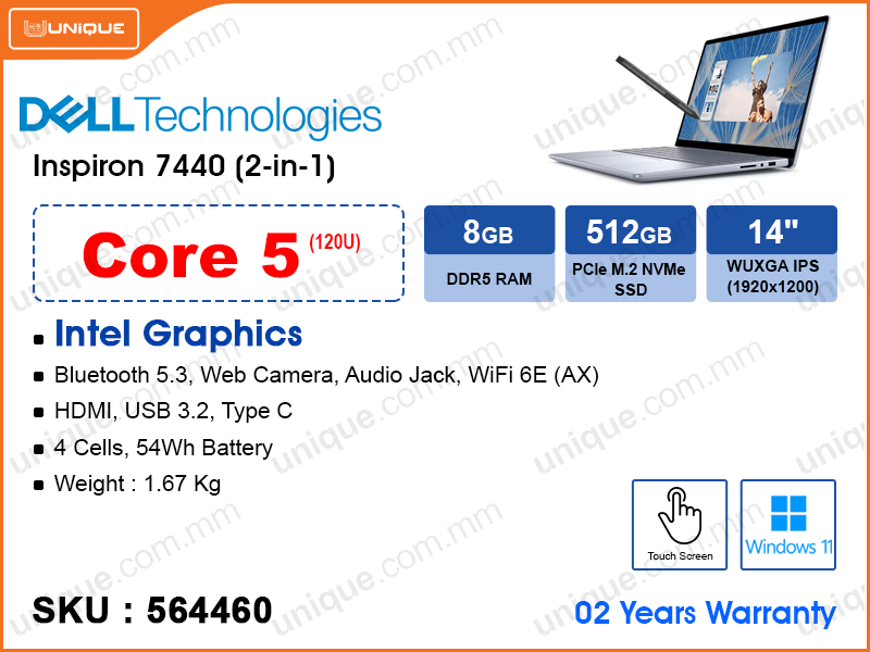 DELL Inspiron 7440 2-in-1 Ice Blue (Intel Core 5-120U, 8GB DDR5 5200MHz (1 slot free, up to 16GB), 512GB PCIe M.2 SSD (up to 1TB), Window 11, 14" WUXGA (1920x1200) IPS, Weight 1.71 Kg)