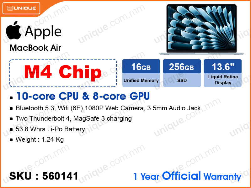 Apple MacBook Air MC6T4ZP/A Sky Blue (M4 Chip with 10-Core CPU, 8-Core GPU, 16GB, 256GB, 13.6", Weight 1.24 Kg)
