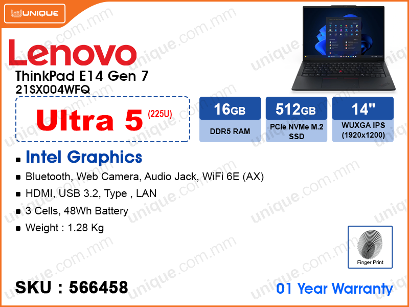 Lenovo ThinkPad E14 Gen 7 21SX004WFQ Black (Intel Core Ultra 5-225U, 16GB DDR5 5600MHz (up to 64GB), PCIe M.2 SSD 512GB (up to 1TB), 14" WUXGA (1920x1200) IPS, Weight 1.28 Kg)