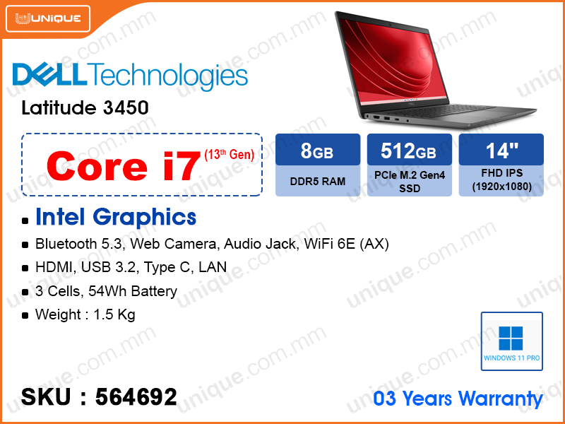 DELL Latitude 3450 Soft Charcoal (Intel Core i7-1355U, 8GB DDR5 5600MT/s (1 slot free, up to 64GB Max), 512GB M.2 PCIe Gen 4 SSD (up to 1TB), Window 11 Pro, 14" FHD (1920x1080) IPS, Weight 1.5 Kg)