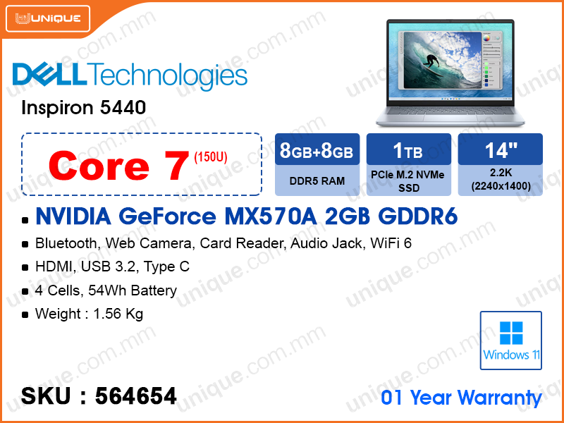 DELL Inspiron 5440 Ice Blue (Intel Core 7-150U, 16GB DDR5 5200MHz (8GBx2, up to 32GB), 1TB M.2 PCIe Gen4 SSD, NIVIDA GeForce MX570A 2GB GDDR6, Window 11, 14" 2.2K (2240x1400), Weight 1.56 Kg)